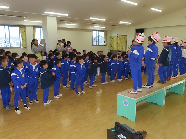 誕生月の園児が冠をかぶっています。担任の先生がその子の特徴を紹介しながら呼び台の上に並びました。