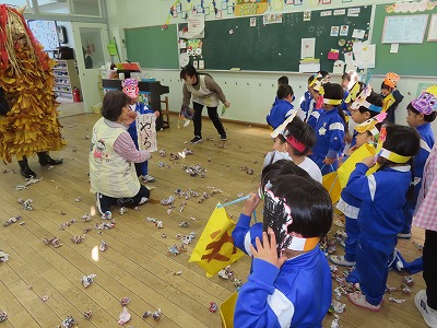 鬼の先触れが太鼓をたたきながらクラスに入ってきます。鬼が入ってくると「キャーキャー!」と逃げながら鬼打ち豆?を投げつけました。