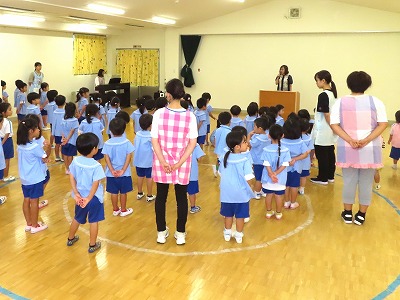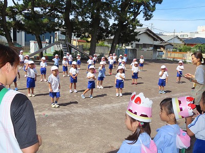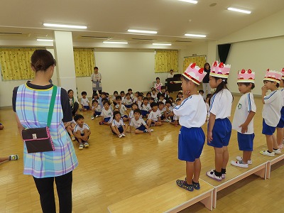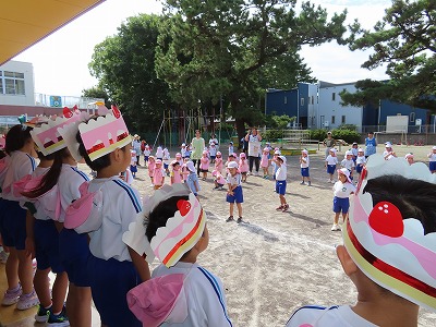令和7年9月19日(金) やっと秋の陽気になったので9:20から園庭でムーンライト誕生会を行いました。全学年が朝のお集りの並び方で並びました。 冠をかぶった誕生月の園児が担任の先生に名前とその子の特徴(友達と仲良くできる子です…)を呼ばれて大きな声で返事をして前に出ます。 一人づつ年齢と名前を聞きました。大きな声で言えました。 続いて運動会で頑張りたいことを聞きました。 「組立体操! 30m競争! 親子競争! 玉入れ! …」などなど頑張りたいものです。 みんなで大きな声で運動会頑張るぞーと言えました。 みんなでお祝いの歌を歌いました。おめでとう!