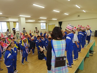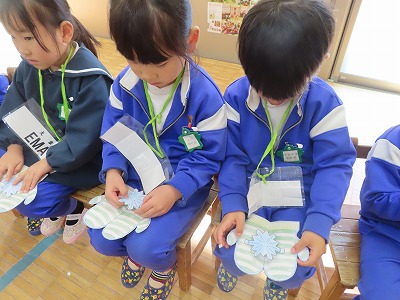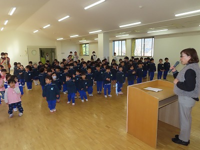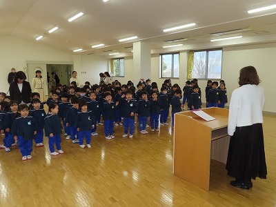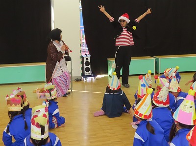 令和7年12月11日(木) りんりん誕生会のあとそのままクリスマス会を行いました。 最初におばあさんが出てきて椅子に座って編み物をしだしました。 「あ〜あ息子たちも独立してひとりぼっち…せめてすてきな若いサンタクロースに会いたいな…」と言いながら寝てしました。 すると夢の中からスノーマンに似たサンタクロースが踊りながら出てきました。 おばあさんもノリノリで楽しそうです。そんなところで夢が覚めました。 各学年が工夫して作った帽子をお互いに見せました。 満3歳児さくらんぼはトナカイの帽子・年少うさぎ組さんはケーキにサンタと雪ダルマ年中くま組さんはサンタクロースの帽子年長ぞう組さんはクリスマスツリーで後ろに長い飾りを付けました。みんなかわいい!